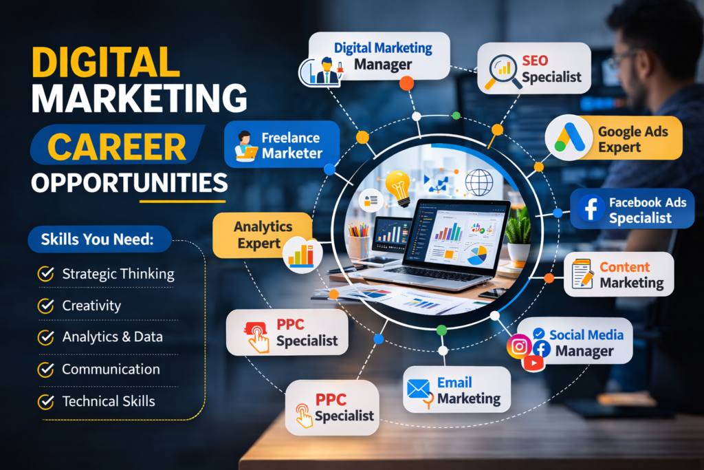 These roles offer excellent digital marketing career opportunities in agencies, companies, and freelancing.